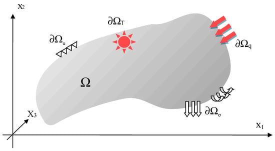 Fulfilled for any configuration of the region Ω, where , , and are stiffness matrix, displacement vector, and nodal loads vector, respectively. The same discretization serves for the discretization of the temperature field by the nodal temperatures vector as [,]