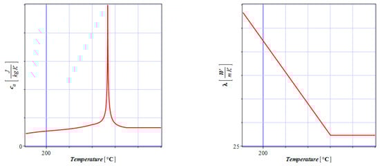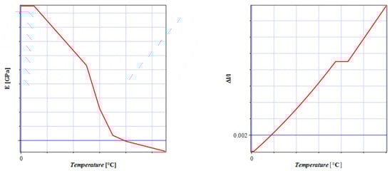 Equations (26) and (31) are finally solved simultaneously by the system ABAQUS to obtain time fluctuations of the deformations and stresses into the given boundary thermo-elasticity problem. This coupled problem is solved in a homogeneous continuous domain with no initial stresses and strains. A steel material occupying this domain shows temperature-dependent material and physical characteristics presented in Figure 2 and Figure 3 below. It is reported here, after experimental works included in Eurocode 3 [], that Young modulus as well as heat conductivity decrease while increasing temperature induced into the steel volume, quite opposite to thermal elongation, which increases. Heat capacity shows very complex behavior in this situation, especially in terms of the singularity reached close to 700 °C. This singularity results in remarkable difficulty during a solution of Equation (31), which is practically omitted by listing heat capacity at each 50 °C and numerical interpolation in-between these discrete data.