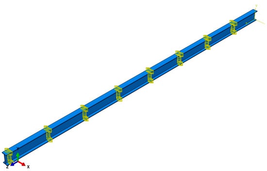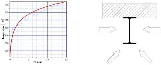 The numerical example consists of the 6m both ends fixed steel I-profile beam with linear load applied to top flange equal 2.0 kN/m (Figure 4), whereas its cross section and the FEM discretization have been shown in Figure 5. The mesh consisting of 34,800 brick finite elements has been used; they are denoted in the system ABAQUS as C3D8T: the 8-node thermally coupled brick, tri-linear displacement, and temperature. The edge length of each brick element is less than 10 mm and it guarantees quite smooth approximation of stress distribution throughout the web. The thermal load has been adopted from the Standard ISO fire curve (Figure 6). According to Eurocode fire fumes after time tf = 15 min are about 740 ºC. This thermal load has been applied to each side of the cross-section except the top flange where the concrete slab lays according to the given fire scenario (Figure 6). Surface radiation and surface film conditions as thermal loads have been applied in this model (Figure 7). All material parameters are fully temperature-dependent and the fully coupled transient temperature-displacement incremental analysis has been used with the full Newton solution technique. The total time period of numerical simulation has been set as 900 s. The initial increment size is 0.01 step time, in this case, the minimum increment size is 0.0001 of the step time, and the maximum increment has been fixed as a single second.