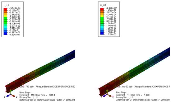 Deflections of the beam at t = 900 s (left–under, right–without a fire).