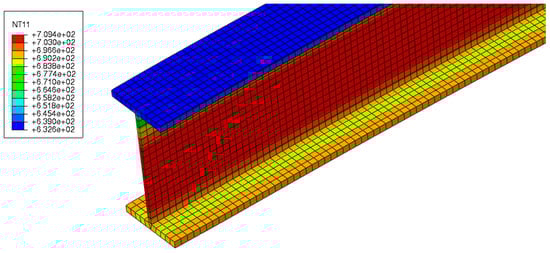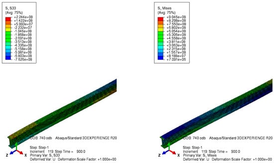Figure 8 shows a comparison of this beam deflection under the given fire conditions (left diagram) and without a fire (right diagram). It is noticeable that fire heating increases the extreme deflection at half of the beam span more than four times (13.0 cm) than its admissible value (3.0 cm); maximum deflection in this case of no fire is less than 2.0 mm. One concludes that extreme deformation in the beam under fire is two orders larger than for the beam with no temperature attached (analytical approximation following basic equations of strength of materials appears to be quite efficient). The second major difference in-between these two models is that a beam subjected to fire shows remarkable deformations close to the supported area, whereas the beam without fire loadings has these deformations negligibly small. Next, Figure 9 reports normal stress marked as S33 (left diagram) and the reduced von Mises stress (right diagram). Von Mises stresses are almost 4 times larger than the longitudinal stresses in this specific case and both stress fields exhibit quite different distributions along the beam and throughout its cross-section. Figure 10 shows for a completeness temperature distribution at the steady-state (at the end of the beam heating by a fire) and one compares with an engineering intuition that the thinner web accumulates definitely more heat than the relatively thicker rest of the beam.