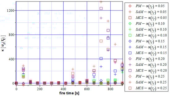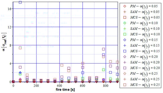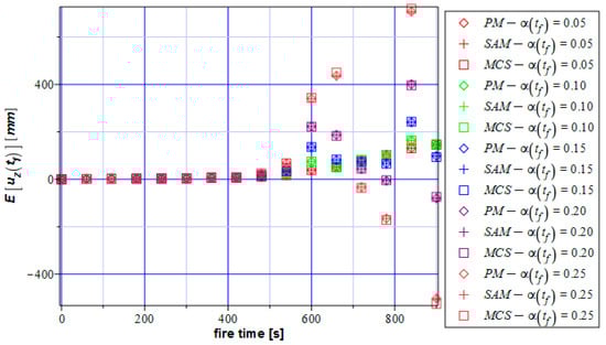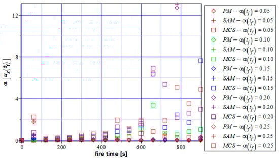 Further results concern probabilistic characteristics of the structural response, which include expectations, coefficients of variation, skewness, and kurtosis of displacements shown in Figure 11, Figure 12, Figure 13 and Figure 14, correspondingly. They have been computed using three different probabilistic methods, namely the perturbation method (abbreviated as a PM here), the semi-analytical method (SAM), and also using the Monte-Carlo simulation (MCS); they have been shown all as the functions of the input coefficient of variation ranging from 0.0 until 0.25. They concern extreme vertical displacements obtained at the half of the beam structure for the needs of further reliability assessment according to the Serviceability Limit State (SLS). First of all, it is seen that the first two moments are stable until t = 500 s, and then they start to diverge; initially, both moments equal almost 0. Generally, three different probabilistic numerical methods coincide in the case of the first two probabilistic characteristics with each other until α = 0.20. Higher order statistical characteristics are more dispersed—they exhibit both numerical values very close to 0, which start to diverge at about t = 500 s. This can be interpreted that until this time moment of the fire exposure, the resulting displacements can be approximated as Gaussian, which means that both the FORM expression for the reliability index as well as its relative entropy counterpart proposed by Equation (43) are justified very well. Finally, one can notice that all three probabilistic methods coincide very well until α(tf) = 0.10.