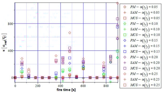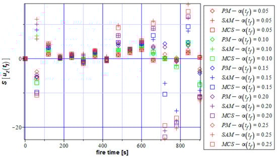 A more detailed comparison of the classical FORM approach with the proposed new one based upon the relative entropy has been provided in Table 1 below (βFORM(uz(tf))) and relative entropy approach (β(uz(tf))). Both reliability indices have been compared with each other throughout the entire fire accident simulation time for the few different values of input coefficient of variation. There is no doubt that both methods return almost the same values (positive and negative also) for any input statistical scattering. Furthermore, a failure time defined as the moment of fire duration when the reliability index falls down below the admissible values suggested in the designing codes (t = 80 s) in both methods is also almost the same. It seems that the rescaled relative entropy calculated from Equation (43) enables to predict fire safety with the use of the existing engineering codes.