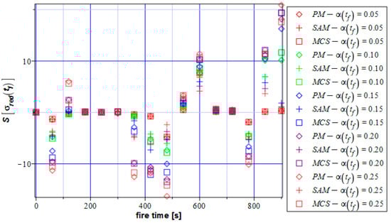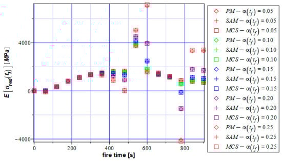 The next set of probabilistic characteristics computed for the reduced von Mises stresses is given similarly in Figure 15, Figure 16, Figure 17 and Figure 18. They have been collected here as decisive in the calculation of the reliability index in the Ultimate Limit State (ULS). The expected values increase monotonously from 0 until the same moment t = 500 s; then, they exhibit large fluctuations, although all three probabilistic methods return the same numerical values. The reduced von Mises stresses start to highly depend upon the input coefficient of variation for the fire exposure time t > 500 s, which is an observation quite unusual for elastic problems with any uncertainty. A little bit different conclusions can be drawn from the results contained in Figure 16—the output CoVs keeps very close to 0 during the entire fire heating process showing some numerical discrepancies almost at the beginning of this process (t = 50 s) as well as its end (t = 800 s). Higher order statistics are rather distant from 0 (see Figure 17 and Figure 18), so they cannot be efficiently modeled as Gaussian and need larger numerical effort. A coincidence of Monte-Carlo simulation, the semi-analytical method as well as the stochastic perturbation technique is worse and can be assumed α(tf) = 0.05. This is a quite expected result because probabilistic characteristics of the stresses are calculated based on probabilistic moments of displacements (since displacement-version of the FEM is used) and of probabilistic characteristics of the constitutive tensor (additionally depending on the nodal temperatures).