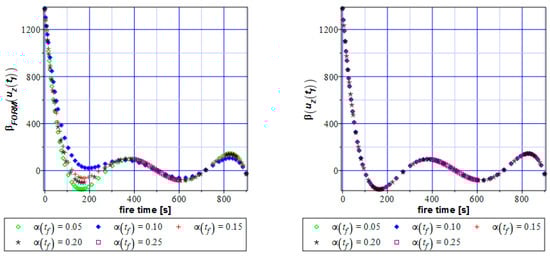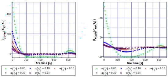 Higher order statistics of the reduced stresses are definitely distant from 0 during fire exposure time, so that these stresses cannot be approximated with the Gaussian distribution. Therefore, the FORM index given in Equation (40) includes a remarkable modelling error, whereas relative entropy should be calculated here using the general analytical formula (42). Further numerical results concern reliability analysis of the given structure, so that Figure 19 contains the key results in this study and presents a comparison of the reliability indices determined using the FORM approach (left graph) with these calculated thanks to the Bhattacharyya relative entropy. They are both plotted as the functions of the fire exposure time and are related to the Serviceability Limit State. This is because previous results document well approximation of the distribution of the displacement by the Gaussian PDF; this is not the case with the reduced stresses, so their reliability has been discussed in Figure 20 using the FORM index only. As one could expect, these time fluctuations of reliability indices have typical exponential decay in the first stage of fire heating, but then, after reaching critical and 0 values, exhibit further oscillatory character. This part is interesting from the numerical point of view and has no practical importance and the structure lost its reliability. Such a wavy character is totally absent for civil engineering structures subjected to, i.e., static loads and some stochastic ageing process, when reliability decreases monotonously.