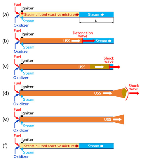 For producing the USS, a new method is proposed [41]. The essence of the method is illustrated in Figure 1. The main element of the USS generator is a pulsed detonation gun (PDG). The PDG is simply a tube with one closed and another open end. The closed end is equipped with ports for the supply of fuel, oxygen, and low-temperature steam (110–120 °C) from the corresponding manifolds with control valves. The operation cycle starts with partially filling the PDG with a plug of low-temperature steam with length ( is determined by the steam flow rate and fill time), followed by supplying the components of a reactive mixture: fuel, oxygen, and in general, low-temperature steam as a diluent. After ignition of the reactive mixture with a spark igniter (see Figure 1a), flame acceleration, and deflagration-to-detonation transition (DDT), a developed detonation wave propagates at a very high velocity (~2000 m/s) through the reactive mixture, transforming it into the detonation products, composed primarily of USS and CO2 at very high temperature and pressure (see Figure 1b). When transitioning into the plug of low-temperature steam, the detonation wave is converted into a strong but decaying shock wave that compresses and heats up the steam to a very high temperature and pressure (see Figure 1c). After the shock wave exits through the open end of the PDG, the high-temperature and high-pressure USS begins to expand into the ambience as a high-velocity (in average, above 1000 m/s) jet (see Figure 1d). When the pressure in the PDG drops down to the ambient pressure, a new plug of low-temperature steam is supplied to the PDG through the port at the closed end (see Figure 1e), followed by a feed of the reactive mixture components: fuel, oxygen, and low-temperature steam as a possible diluent (see Figure 1f). Upon completely filling the PDG, a spark igniter is triggered to begin the next operation cycle (see Figure 1a). Note that the detonation products of the mixtures of fuel with oxygen can contain enough USS and CO2 that the dilution of the reactive mixture with the low-temperature steam can be optional.