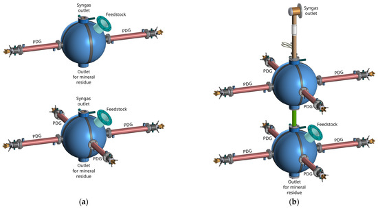 Schematics of the units for organic waste gasification by the USS: (a) a single flow-through gasifier with one and two pairs of PDGs; (b) a cascade of two flow-through gasifiers with two pairs of PDSs.