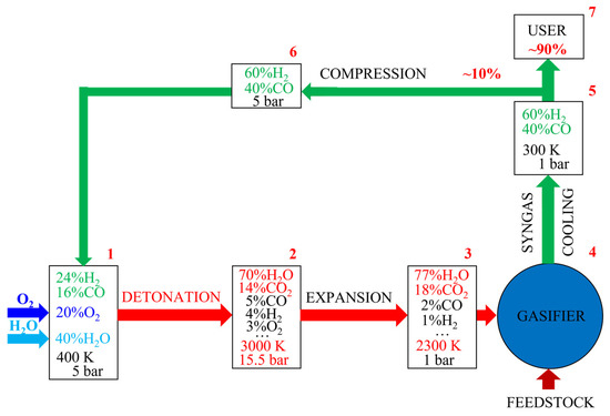 As an example, Figure 3 shows the flow chart of the gasification plant operation. It is assumed that the plant operates on the oxygen mixture of the syngas produced by the gasification of a specific organic feedstock, which provides syngas with a molar H2/CO ratio of 1.5. The concentrations of the major species in the boxes are calculated using the thermodynamic code (see [41,47,48]). Box #1 corresponds to the feed of syngas and oxygen in the stoichiometric amounts, as well as low-temperature steam as a diluent to the PDGs. Box #2 shows the approximate composition, temperature, and pressure of the detonation products in the PDGs. Box #3 shows the approximate composition and temperature of the detonation products expanded from the PDGs to the gasifier operating at a mean pressure slightly above 1 bar. Box #4 shows the gasifier with the supply of a feedstock and gasifying agent, as well as removal of the hot product syngas. Box #5 shows the expected composition of the cooled dry syngas. Approximately 10%wt. (see the next section) of the cooled dry syngas is compressed to approximately 5 bar and directed back to the USS generator through the compressor (box #6). Finally, approximately 90%wt. of the cooled dry syngas is directed to the user.