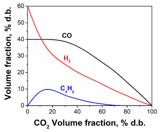 Recent experimental studies [47,48] confirm the high quality of the syngas product obtained from natural gas, liquid (waste machine oil, heating value ~42 MJ/kg), and solid (birch wood sawdust, heating value ~18 MJ/kg) wastes by the detonation-born USS conversion/gasification in the gasifiers 40 and 100 L in volume. Figure 4 shows the averaged measured compositions of the cooled dry syngas in terms of the dependences of the steady-state values of H2, CO, and CxHy volume fractions on the CO2 volume fraction. The scatter of the experimental data relevant to Figure 4 is approximately 5%vol. for H2, CO, and CO2 and 2%vol. for CxHy. The CxHy is mainly represented by CH4 (hydrocarbons larger than C2 were not found in the gas probes [47,48]). With the increase in the process temperature, the volume fraction of CO2 decreases, leading to a gradual increase in the volume fractions of H2 and CO to approximately 60 and 40%vol dry basis (d.b.), whereas the volume fraction of CxHy reaches a maximum at a CO2 volume fraction at approximately 10–20% d.b. and tending to zero at CO2→0.