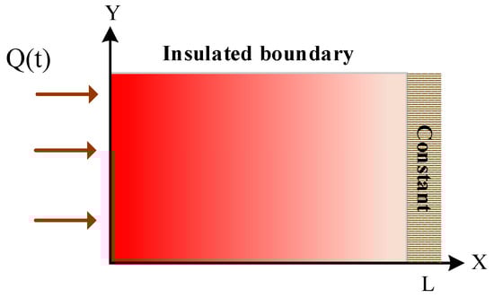 In the paper, the IHCP of heat conduction system is studied. A schematic diagram of heat conduction is shown in Figure 1. The left boundary is the uniformly distributed heat flux boundary varying with time, the right boundary is the constant temperature boundary, and all other boundaries are insulation boundaries. Assuming that the material properties of the system do not change with temperature, there is no obvious temperature difference in the y-axis at any position during heat conduction. Therefore, the heat transfer system can be simplified to one-dimensional heat conduction. The governing equation of one-dimensional heat conduction is as follows: