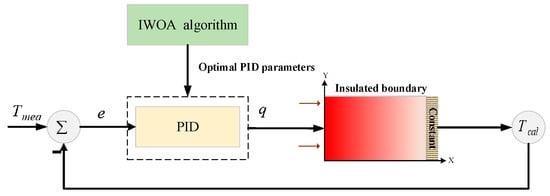 To the shortcomings of the traditional PID inverse algorithm, such as complex parameter tuning process and poor adaptive ability, a PID method based on the improved whale optimization algorithm (IWOA-PID) is proposed for inverse estimation of the thermal boundary. The schematic diagram of the heat flux inverse estimation by IWOA-PID is shown in Figure 2.