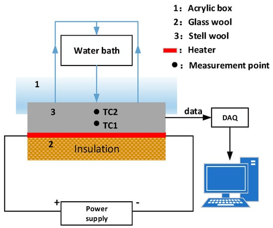 In order to verify the effectiveness and accuracy of the proposed method, the experimental scheme of the literature [] is simulated in the paper to investigate the one-dimensional unsteady IHCP. The diagram of the experimental device is shown in Figure 3. The test plate has 80 mm width, 96 mm height and 20 mm. One side of the test plate uses a thin mica thermofoil heater, with the other side subjected to a constant temperature by circulating cooling water from a high heat removal capacity water bath. All other sides of the test plate are heavily insulated in order to ensure unidirectional heat transfer. Details can be found in reference [], and through the data acquisition (DAQ) device to obtain the temperature measurement information. The thermal physical parameters of the experiment are as follows: , , , initial temperature , time step , space step .