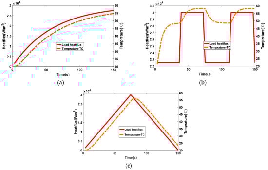 The heat flux of the above three different types is applied to the heat transfer system and the temperature at the measurement point is obtained using the finite difference method. The results are shown in Figure 4. The temperature curve in Figure 4 is the calculated value of the measurement temperature at the end position of the heat transfer system. The temperature at the measuring point changes continuously with the change in heat load. There is a significant delay in the temperature change of the measurement point with respect to the change of the heat flux because the temperature of the measurement point is some distance away from the heated end, and the heat diffusion needs some time, the length of which usually depends on the material properties.