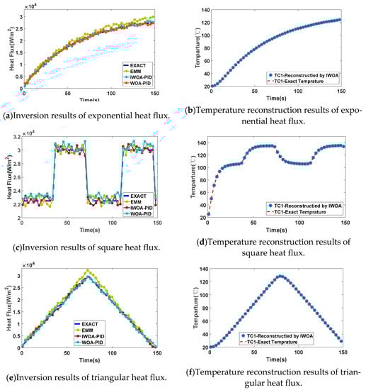 Select the location of the measurement point TC1 at 0.02 . Measurement errors  is . The exact matching method (EMM) [], WOA-PID and our method were respectively used to estimate the above three kinds of heat flux. The results of the inverse heat flux change at the heated end are shown in Figure 5a,c,e. From Figure 5, it can be seen that the IHCP proposed in the paper can accurately inverse the change of the actual loaded heat flux, and the inverse results of EMM and WOA-PID have a large error with the actual value. Thus, the effectiveness of our method in solving the IHCP is demonstrated. The TC1 temperature reconstruction curves of the measurement points under the three heat fluxes are obtained by our method as shown in Figure 5b,d,f. It can be seen that the temperature of the measured point reconstructed by our method is almost consistent with the actual temperature. The inverse heat flux error  and temperature reconstruction error  in three heat flux forms are shown in Table 1. The accuracy of our method in solving the IHCP is verified by comparing with WOA-PID and EMM algorithms. Compared with WOA-PID and EMM algorithms, both  and  of our method are minimal, which proves the accuracy of our method in solving IHCP.