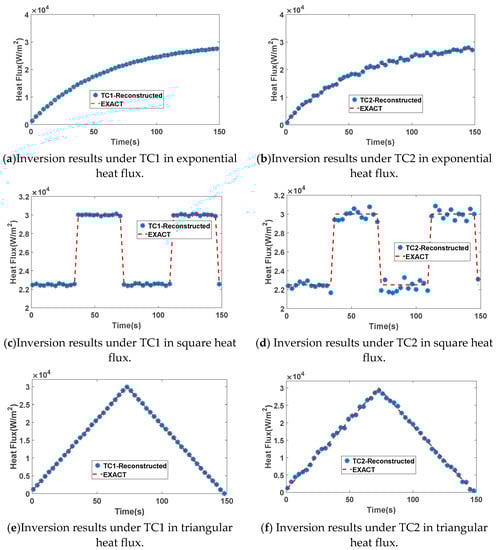 The inversion results for the three heat flux types at TC1 are shown in Figure 6a,c,e, and the inversion results at TC2 are shown in Figure 6b,d,f.