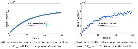 Influence of measurement error on inversion results. (a) is inversion result under maximum measurement error  in exponential heat flux. (b) is inversion result under maximum measurement error  in exponential heat flux.