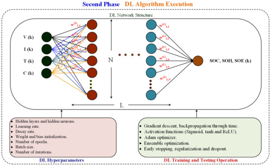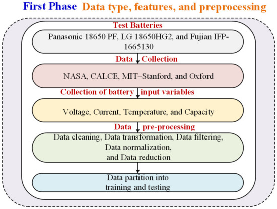 The execution of DL approaches for SOX estimation can be allocated into three phases. The first phase includes appropriate battery selection, data collection, data extraction, data preprocessing, and data division into training and testing, as depicted in Figure 2.