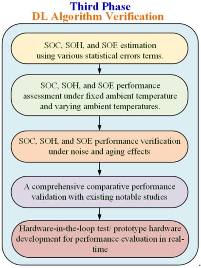 The third phase consists of the validation and verification of DL methods using various statistical error terms and performance assessments under a fixed ambient temperature and varying ambient temperatures. Moreover, the performance is further verified under noise and aging impacts. In addition, a comparative analysis with the recent literature can be carried out to check a DL-based SOX estimation in terms of accuracy and robustness. Furthermore, hardware-in-the-loop tests and prototype hardware validation can still be conducted. Performance validation procedures are shown in Figure 4.