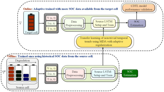 Chen et al. [48] developed a SOC estimation framework with an LSTM model considering the extended inputs and constrained output. The experimentations were performed on a battery dataset attained from the Center for Advanced Life Cycle Engineering (CALCE) and based on loading conditions similar to the Federal Urban Driving Schedule (FUDS) and Dynamic Stress Testing (DST). The validation of the proposed model was conducted based on different temperatures, such as 0 °C, 10 °C, 20 °C, 30 °C, 40 °C, and 50 °C, respectively. The LSTM model was also validated with different intelligent models, and the results concluded that the SOC error of the proposed LSTM model was lower contrasted with other NN approaches. Although the validation was conducted based on different operating temperatures, further assessment can still be conducted based on different battery datasets. Almaita et al. [49] proposed an LSTM algorithm-based SOC estimation of high-capacity grid-scale lithium-ion BSSs so that the power profile in the power system could be improved. The battery dataset was attained from AL-Manara PV power in Jordan which consisted of a battery storage capacity of 12 MWh. Three important battery features, temperature, current, and voltage, were considered for the SOC estimation. The LSTM model was validated with a feedforward neural network (FFNN) and deep feedforward neural network (DFFNN). The outcomes depicted that the LSTM model was highly accurate with a mean squared error (MSE) of 0.62% compared to the SOC of the DFFNN and FFNN in the ranges of 4.03% to 7.37% and 5.37% to 9.22%, respectively. The LSTM-based SOC estimation delivered satisfactory outcomes and can be implemented in high-capacity BSSs. Nonetheless, the justification of the suggested approach with another battery dataset can be used in further research activities. Oyewola et al. [50] improvised the LSTM approach to develop a controllable deep transfer learning (CDTL) network for SOC estimation, as presented in Figure 5. The suggested CDTL network enhanced the target LSTM for long-term SOC estimation. The MIT Stanford battery database consisting of 124 lithium-ion battery datasets was employed for the proposed work. However, only three battery datasets were chosen for the experimentation. The CDTL network achieved higher SOC estimation accuracy with a root means square error (RMSE) of 0.70% compared to the benchmark approaches, such as LSTM and autoencoder. The proposed CDTL model enhanced transfer learning capability by 50%; however, the algorithm demonstrated high complexity for hardware implementation.
