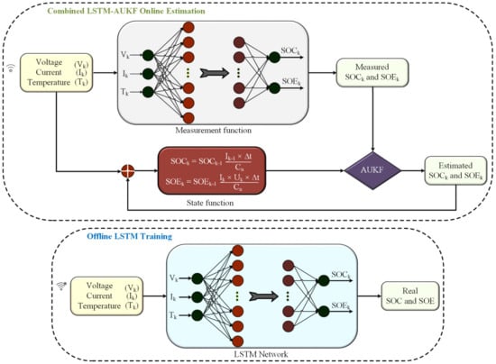 Fan et al. [60] developed a hybrid LSTM-AUKF model-based coestimation framework for SOC and SOE, as shown in Figure 6. The battery dataset was acquired from the CALCE battery database. The LSTM-UKF model was validated with various dynamic driving schedules under different initial errors and operating temperatures. The performance error based on RMSE and MAE delivered appropriate outcomes of 0.46% and 0.44%, respectively. Additionally, the LSTM-AUKF model was computationally more effective compared to other models, such as autoencoder-LSTM models and forgetting factor-based adaptive EKF algorithms. Further research can still be conducted based on embedded BMS test platforms and validation in real-time applications.