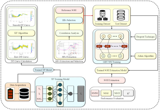 Chen et al. [66] developed a GRU approach-based SOH estimation technique for lithium-ion batteries, as displayed in Figure 8. Apart from the GRU model, the ELM method was used to forecast the entire temperature variation, and KF was employed to smoothen the data. The experimentation was performed by extracting eight commercial kokam pouch cell suitable battery datasets from the University of Oxford. The hyperparameter of the GRU model was selected by the trial and error (TE) technique by changing the number of hidden neurons. The RMSE, mean absolute error (MAE), and MAXE were within the limits of 1.2%, 1.02%, and 2.28%, respectively. In future research, more emphasis can be given to the extraction of more varying and extensive datasets based on different operating temperatures for model training.