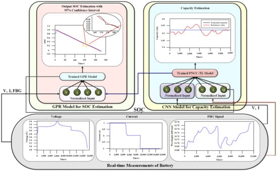Fan et al. [69] presented a SOC estimation approach for lithium-ion batteries by employing a CNN model with a U-net architecture. The public dataset from the Panasonic 18,650 PF cell was employed with a nominal voltage of 3.6 V and nominal capacity of 2.9 Ah. The data collection was conducted based on five different temperatures from 20 °C to 25 °C. The outcomes revealed that an RMSE of 1.4% was achieved at a constant temperature and 1.8% at variable temperatures, respectively. The method was easily executed with satisfactory outcomes; however, validation of the proposed method was not carried out with another model. Cui et al. [70] introduced a CNN-based hybrid model consisting of a CNN and bidirectional weighted GRU (BWGRU). The proposed method limits the influence of battery parameters on the SOC outcomes through a “multi-moment input” structure and bidirectional network. The experimental setup was based on the Mendeley battery dataset which was organized under 12 driving conditions at low temperatures, namely Mixed 1–8, UDDS, HWFET, US06, and LA92. The CNN-BWGRU method was validated with other conventional GRU and CNN-GRU models to demonstrate the effectiveness and accuracy of the proposed model. Further works can be performed to validate the effectiveness of the proposed model based on different temperatures and different aging conditions, respectively. A combined SOC and SOH estimation scheme based on a pruned convolution neural network with a transfer learning model and Gaussian process regression (GPR) was proposed by Li et al. [71], as shown in Figure 9. Additionally, fiber Bragg grating (FBG) sensors were employed to acquire better process-related signals by connecting them with the battery surface in order to capture the temperature variation due to battery charging and discharging. The proposed work was based on four commercial lithium-ion battery cells with a nominal capacity of 1.6 Ah and nominal voltage of 3.2 V. The SOC estimation with regard to the RMSE and mean standard deviation (MSD) with FBG signals was 3.59% and 1.02%, respectively, and without FBG was 4.3% and 1.77%, respectively. Further research can still be conducted to explore the application of FBG sensors in the state estimation of batteries. Gong et al. [72] developed a novel CNN-based SOC estimation framework for lithium-ion batteries. The data framework for the model training consisting of voltage, current, and temperature sampled in 10 s. The proposed work was conducted based on two public battery datasets from the NASA Ames Research Center and Oxford Battery Degradation dataset. The CNN model operation was evaluated based on different criteria, such as battery datasets and different input lengths. The CNN model for SOC estimation was satisfactory; however, validation with other DL models was not conducted, which could depict more effectiveness of the CNN model.