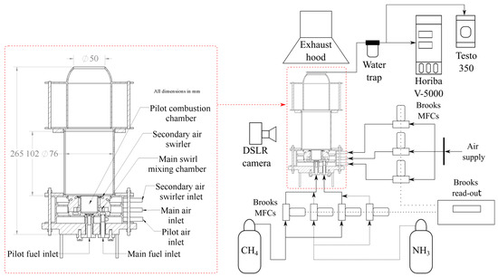 - Okafor, E.C.; Somarathne, K.D.K.A.; Ratthanan, R.; Hayakawa, A.; Kudo, T.; Kurata, O.; Iki, N.; Tsujimura, T.; Furutani, H.; Kobayashi, H. Control of NOx and Other Emissions in Micro Gas Turbine Combustors Fuelled with Mixtures of Methane and Ammonia. Combust. Flame 2020, 211, 406–416. [Google Scholar] [CrossRef]