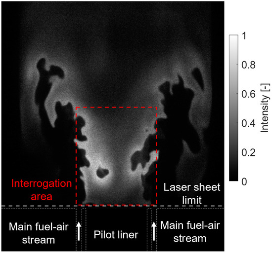 Six hundred images were recorded for each operating condition to achieve statistical convergence of the mean values. Background subtraction was applied to each instantaneous image. An interrogation area of 370 × 400 pixels was chosen to calculate the normalized OH intensity close to the pilot outlet. Figure 3 presents an example of single-shot OH image and highlights the selected interrogation area as a red dashed rectangle. The average OH-PLIF intensity was calculated for each image in this interrogation area. Then, the corresponding 600 values were averaged for each condition and normalized by the maximum value found across all operating conditions. In addition, the 600 single-shot images were averaged for each condition and then normalized with the maximum and minimum values found across all operating conditions to obtain a normalized, time-averaged OH-PLIF image for each condition.