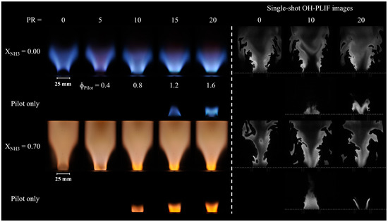 The two lowest rows of Figure 4 also show the NH3–CH4–air flames exhibiting the typical orange hue attributed to the NH2 alpha band chemiluminescence [28] and NO2* [29]. Longer flames are observed during the experiments compared with CH4-air flames, and none of the flames seem lifted if only direct broadband images are considered. However, a careful study of instantaneous OH-PLIF images shows that there is no thin reaction layer anchored to the rim of the pilot liner, regardless of PR. At this location, only hot burnt products exist, within which OH radicals remain even though no heat is being released, and these are also responsible for the bright orange light emissions immediately downstream of the pilot. The presence of radiating hot products immediately downstream of the pilot liner for PR = 0% is most probably due to a recirculation from the downstream region because of the swirl motion.