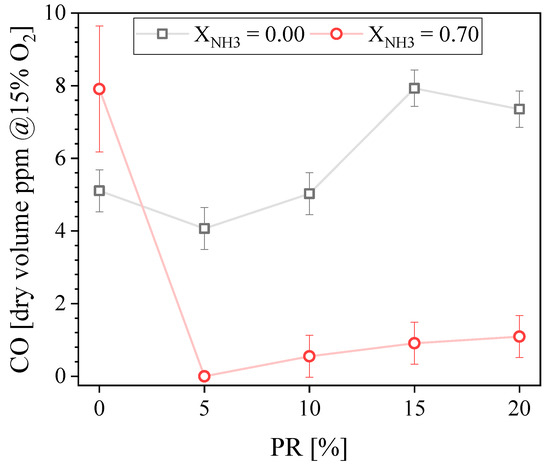 Figure 5 shows the measured exhaust CO concentration as a function of the PR. It is below 10 ppmvd for all CH4-air or NH3-CH4-air flames. For CH4-air, the CO concentration somewhat increases when PR increases, which is consistent with findings of [10,30] and can be explained by the fact that the non-premixed pilot flame is more prone to yield CO that the lean premixed main flame. However, it can be argued that CO variations are small and within measurement uncertainties and are, as such, not very meaningful. For NH3–CH4–air flames, the maximum CO concentration is found for PR = 0 and it is higher than for the CH4-air counterpart. This can be explained by the unstable behavior of this flame that promotes incomplete oxidation. The minimum CO concentration is found for PR = 5% and is below the detection limit of our measurement unit. This is because this flame is stable, it has a relatively small amount of carbon in its fuel blend, and it has a comparatively weak contribution from the non-premixed pilot flame. Because the pilot flame is more prone to produce CO that the main lean premixed flame, the CO concentration increases when PR is increased beyond 5% also for the NH3–CH4–air flames.