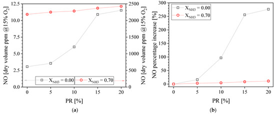 Measured NO concentration in the exhaust gases (a) and NO percentage of increase (b) as a function of the PR.