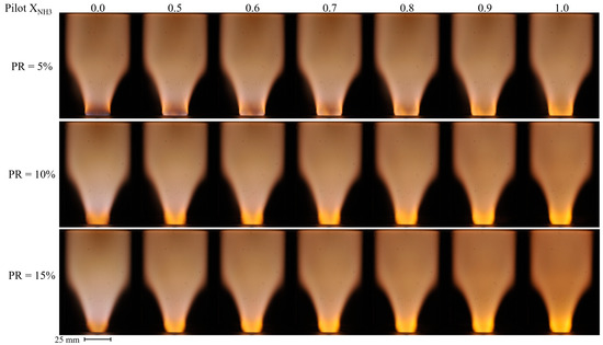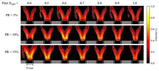 Figure 8 shows the time-averaged broadband images of NH3–CH4–air flames for three different PR (5, 10, and 15%) as a function of the pilot XNH3. The main fuel composition was constant throughout this measurement series, with an NH3 volume fraction of XNH3 = 0.70. In general, the flames present the typical V-shape observed for swirling turbulent flames, and the orange-yellow hue is attributed to the NH2 alpha band, H2O radicals [28,38], and NO2* [29]. Interestingly, regardless of the pilot XNH3, the flames with PR = 5% are more compact and anchored closer to the pilot liner outlet, compared to the flames with higher PR.