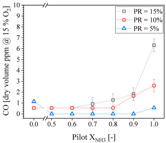 Figure 9 presents the CO concentrations in the exhaust gases as a function of the Pilot XNH3 for three different PR values. All the conditions tested produced CO concentrations below 10 ppmvd. Increasing the NH3 proportion in the pilot flame only increases the CO emissions above some threshold value; the CO concentration then increases rapidly. This threshold value depends on the PR; it is XNH3 = 0.8 and 0.6 for PR = 10 and 15%, respectively. Although unburned fuel was not measured during this experimental campaign, it can be concluded, based on the CO concentration reported in Figure 9, that increasing Pilot XNH3 eventually lead to a small drop in combustion efficiency.