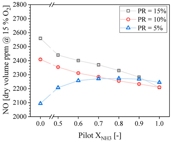 - For a sufficiently powerful pilot (PR > 5%), increasing the proportion of NH3 in the pilot fuel decreases the NO concentration in the exhaust, which is arguably opposite to expectations. For those pilot power ratios, pure CH4 pilot flames produced higher NO emissions. Conversely, the NO concentration was roughly constant for pure NH3 pilot flames, regardless of the pilot power ratio.