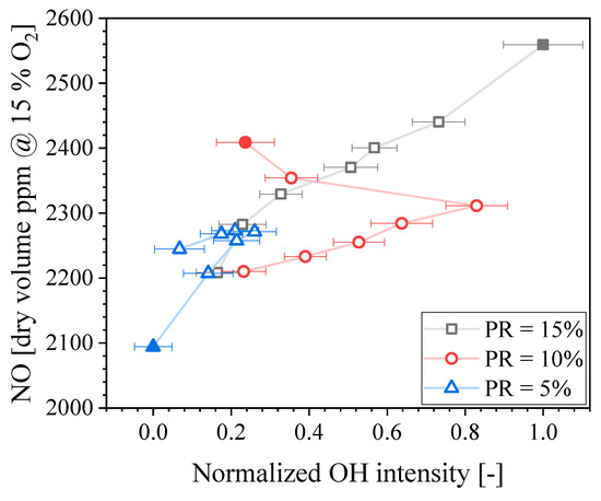 Recall that the fuel composition for the main flame was constant at XNH3 = 0.70. Therefore, the change in NO concentration is due to the PR and Pilot XNH3. It is known that the OH radical plays an important role on NO production in NH3 flames [28,31,36]. Therefore, it is useful to study the influence of PR and Pilot XNH3 on the concentration of OH radicals, which is performed here using OH-PLIF intensity as a proxy. Figure 11 presents the NO concentration in the exhaust gases as a function of the mean normalized OH intensity found in the interrogation area (see Figure 3) for the three PRs tested within the Pilot XNH3 measurement series. Solid symbols correspond to Pilot XNH3 = 0.0, and then the Pilot XNH3 increases following the line for each PR. It is seen that modifying PR and/or Pilot XNH3 affects the OH-PLIF intensity. Because the Q1(6) excitation line selected for these experiments has a moderate temperature sensitivity, it can be said that trends of OH-PLIF intensity are expected to match well that of the actual OH concentration. There is a good correlation between the OH-PLIF intensity and the NO concentration in the exhaust gases for PR = 15%. Increasing the Pilot XNH3 results in lower OH concentration, hence, potentially explaining the lower NO exhaust concentration. Considering error bars, this positive correlation also exists for PR = 5%. However, a non-monotonic trend is found for PR = 10% and the linear correlation between NO and OH no longer holds. Figure 11 shows that the OH intensity for PR = 10% first decreases when Pilot XNH3 decreases until = 0.6, and then it increases. This suggests that the OH concentration in the inner recirculation zone located immediately downstream of the pilot is not the only driver for the observed trends of NO concentration.