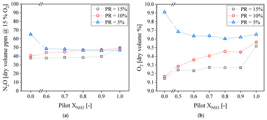Measured N2O (a) and O2 (b) concentration in the exhaust gases as a function of the pilot NH3 for different PRs.