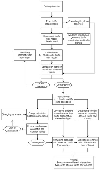 A diagram of the research conducted, describing the evaluation method, is shown in Figure 1. The first stage of the research was the designation of a test site, which was used to collect actual traffic data. Measurements and observations were then recorded, including traffic volume, queue lengths, the distance between vehicles, and the general behavior of drivers waiting to join traffic at minor turns at the intersection. A microscopic traffic model was then developed to simulate the test site. The parameters of driver behavior were changed to converge with the recorded data in the iterative process. Once the results of the initial model were satisfactory, an energy consumption model was prepared as an external module for use in the simulation. The next steps were to prepare individual scenarios for traffic organization and intersection type for testing with the traffic measurements taken. Finally, scenarios for different traffic volumes were developed and evaluated against the aforementioned scenarios related to the road solution. The entire process allowed us to obtain energy consumption results for a wide range of scenarios while achieving a satisfactory level of reliability due to the initial calibration of the model. The detailed process to obtain results in the individual steps of the method is presented in Section 3.1, Section 3.2, Section 3.3, Section 3.4 and Section 3.5.