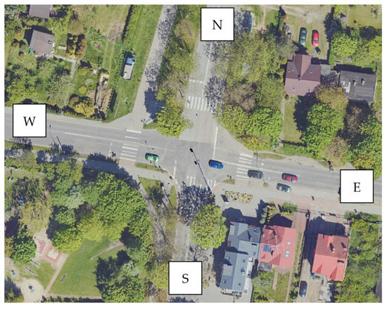 The object under investigation is at the intersection of Dąbka Street and Zielona Street, in the city of Gdynia, in the Pomeranian Voivodeship, in Poland. The location of the intersection is marked in Figure 2. In its current state, the intersection is equipped with traffic signals with a signal cycle time of 60 s. Additionally, at the intersection at night and in the morning, and in exceptional situations, traffic signals are turned off and the following traffic organization is in effect: priority along Zielona Street (northern and southern entries), STOP signs on Dąbka Street (eastern and western entries). The distance from nearby intersections is 400 to 600 m at the eastern, southern, and western entries and 2500 m at the northern entry. There are no traffic disruptions at nearby intersections that would lead to the formation of such long queues so as to affect traffic at the Dąbka–Zielona intersection. Given the traffic conditions and existing organization, the chosen location favors the research of introducing alternatives for the type of intersection and traffic organization.