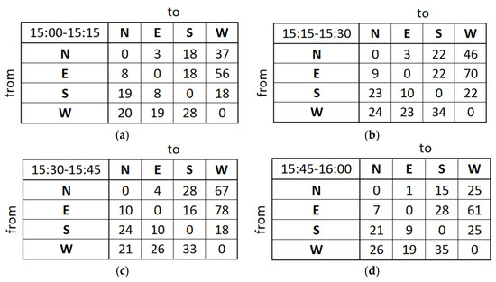 Traffic volume matrices entered into the intersection model at 15-min intervals in the afternoon peak hour. (a–d) contain volumes aggregated to each interval, captioned in the first cell of every matrix.