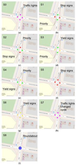 Depending on the purpose of the study and its details, traffic models in the transportation network consider micro-, meso-, or macroscopic relationships. Macroscopic and mesoscopic models make it possible to estimate typical measures of transportation system efficiency (e.g., vehicle kilometers traveled and total vehicle travel time on the transportation network). Macroscopic models consider the capacity of various types of roads, the speeds of vehicles in free-flow traffic, and the resistance functions for different sections of the road network. Mesoscopic models also consider the impact of traffic organization and control, which decide the formation of queues for vehicles and delays within intersections. Mesoscopic models define traffic characteristics and network elements at a higher level of detail than macroscopic models by considering the interrelationships between traffic characteristics at critical locations and their influence on driver behavior about the choice of lanes or travel routes. In the microscopic approach, each vehicle in the network is simulated continuously at the individual level, considering the driver’s response to external stimuli (e.g., caused by traffic signals or information provided by road signs) and considering changes in speed, stopping, and traffic trajectories in interaction with other road users [20,21,22,23].