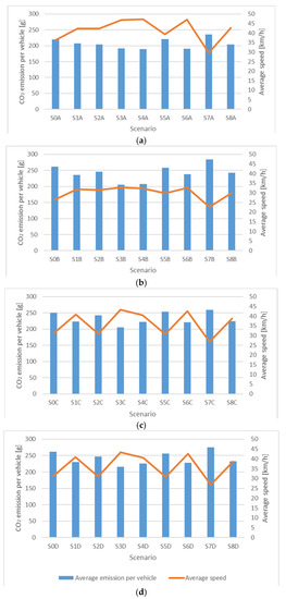 Another limitation of the research conducted for the baseline scenario was the lack of available data on the structure of vehicles that considers propulsion type and engine capacity. Therefore, the simulation assumed gasoline-powered vehicles (the discussion section pointed out a slight difference regarding carbon dioxide emissions of diesel vehicles) and an average engine capacity of 2.0 L. Additionally, changes in driver behavior, driving style, weather and street lighting conditions, and interactions with pedestrians and cyclists were not analyzed in detail. However, the same assumptions that were made for all scenarios allowed the results to be compared. The above aspects will be the subject of future research with more emphasis on single-vehicle traffic characteristics.