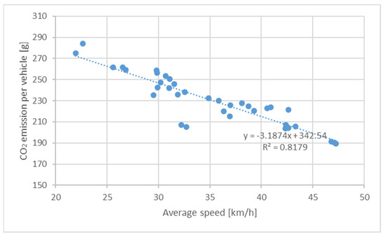 The additional weight may change between journeys, but within a single section it is usually constant, so it can be considered a feature that remains unchanged, at least for individual vehicles within a microscopic simulation. An increase in weight results in greater resistance to movement, so the engine requires greater power to keep the vehicle moving [28,29]. Therefore, this constant element is related to the vehicle’s dynamic characteristics. In addition, according to Nouri and Morency [24], when the weight of the vehicle was increased by an added 100 kg and then 200 kg, it was observed that for the same distance of 14.5 km, emissions increased by 16.15 g and 32.31 g, respectively. In this case and the narrow scope of this analysis, a linear relationship can be seen between increasing vehicle weight and increasing CO2 emissions. The surface area of the front end of the vehicle, as well as the curb weight, is an element that will remain constant for a given vehicle within the analysis and will also affect resistance to movement [28,29] and therefore the value of energy consumption and emissions.