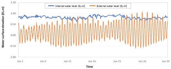 As shown in Figure 1, the tidal observation station is located outside the Nakdong River estuary gate, measuring the water level at frequency intervals of 10 min. Figure 2 illustrates the time series of the water level inside the gate, referring to the river (internal water level), and outside the gate, referring to the sea (external water level), from 1 June 2021 to 30 June 2021, including all the observations (1 June 2021 to 24 August 2021) to enhance the visual interpretation of the figure. As observed inside and outside the river gates, the internal water level is affected by the inflow and outflow of the river, while the external water level mainly changes due to the tide level. Excepting the complete opening of the estuary bank floodgate due to flooding, the river water level varies between EL.0.51 m and EL.1.01 m, with an average of EL.0.76 m.