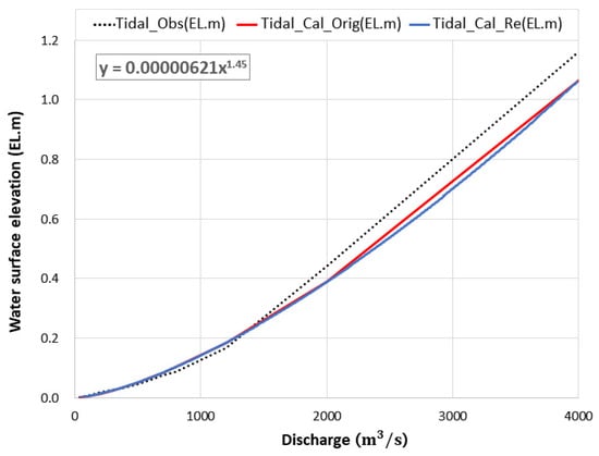 Figure 3 shows the relationship curve between the water surface elevation and the inland discharge from the Nakdong River. The black dotted lines represent the relationship and the time series of the observed water level (Tidal_Obs). The red lines represent those of TASK2K (Tidal_Cal_Orig), while the blue lines refer to those based on the additional calibration using regression (Tidal_Cal_Re). The regression equation is shown below. The simulation results obtained via each method are analyzed in Section 4.