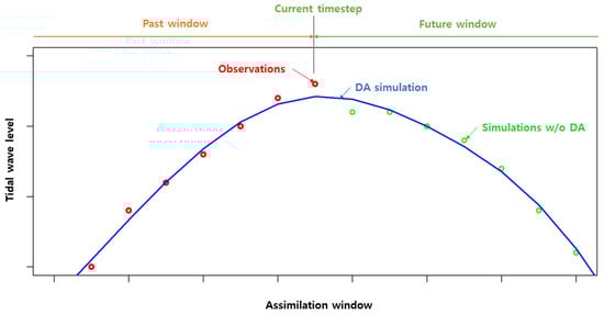 Figure 4 illustrates the way in which the fixed-lag smoother works to enable improved tidal wave prediction. The assimilation window consists of two windows: the past and the future. For part of the past timesteps in the assimilation window, the observations are used as information to construct the smoother function. On the other hand, for part of the future timesteps, in which no observations are yet available, the simulation results provide information to the smoother. The blue line, represented by a polynomial function, is the optimal solution between the observations and simulations within an assimilation window. The least squares regression is utilized to obtain the optimal polynomial function. Since the smoother is optimal only within the given window, the coefficients of the polynomial function are recursively updated at every assimilation step. Unlike the conventional DA methods, which usually require the updating of the model states and parameters, the fixed-lag smoothing technique of tidal wave prediction can provide improved predictions via the optimal polynomial function with no changes in the simulation models. The simplified implementation procedure of the smoother is partly the result of the fact that the errors in tidal wave prediction are mainly associated with the magnitude, and the timing errors are relatively small in number. While benefiting from information based on observations, the polynomial function asymptotically approaches the base simulation, whereby the frequency of the tidal wave is mainly determined by another force, such as the gravity of the moon.