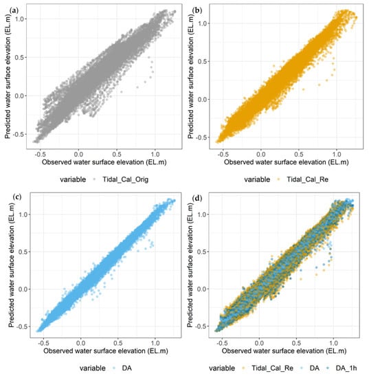 Figure 6 compares the observed and simulated surface water elevation measurements. While the open loop by TASK2K (Tidal_Cal_Orig) is the most dispersed, deviating from a 1:1 line (Figure 6a, the fixed-lag smoother (DA) shows the most significantly improved result, demonstrating that the use of the fixed-lag smoother can further improve the prediction based on regression.