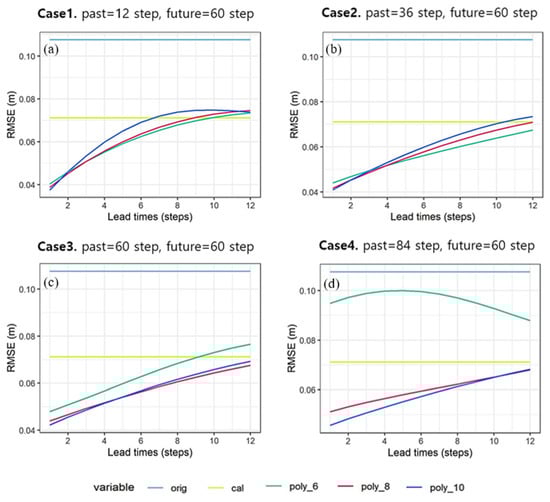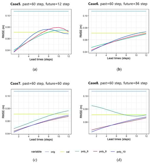 In Case 5, at the forecast lead time of six steps (1 h), the values of the RMSE are 0.064 m, 0.067 m, and 0.073 m for the 6th, 8th, and 10th polynomial orders, while in Case 6, they are 0.058 m, 0.058 m, and 0.06 m for the same polynomial orders, respectively. In Cases 7 and 8, the performance was the best using the 8th polynomial at the lead time of 6 steps (1 h). In Case 7, at the forecast lead time of six steps (1 h), the values of the RMSE are 0.063 m, 0.056 m, and 0.057 m for the 6th, 8th, and 10th polynomial orders, while in Case 8, they are 0.075 m, 0.057 m, and 0.057 m for the same polynomial orders, respectively.