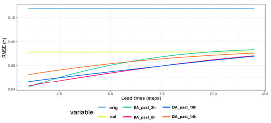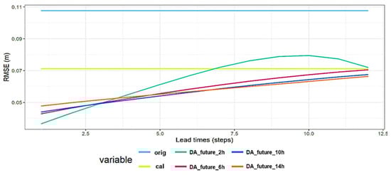 Figure 10 shows the results of the simulation of the future prediction period and evaluation using the RMSE evaluation index for each lead timestep. The past observation period was fixed at 60 steps, the 8th polynomial, and 12 steps (2 h) for the lead time. In Figure 10, DA_future_2 h to DA_future_14 h indicate that the length of the future prediction interval is set to 24-step intervals, ranging from 12 steps to 84 steps (2 h, 6 h, 10 h, and 14 h). The ranking for the 1 h lead time according to the RMSE (m) values in the graph shows the order of 1. DA_future_10 h (0.056 m), 2. DA_future_14 h (0.057 m), 3. DA_future_6 h (0.058 m), 4. DA_future_2 h (0.067 m). As a result of the simulation of the control of the past DA window past size at the 8th polynomial, it was found that the optimal past DA window size for the 1 h lead time was 10 h.