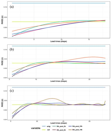 Performance of tidal wave prediction with varying DA lead times: (a) up to 3 h lead time; (b) up to 6 h lead time; (c) up to 12 h lead time.