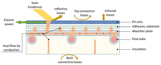 The heat transfer is modeled in 1D. The heat flow absorbed by the metal plate is largely conducted to the tubes according to the monodirectional model of a rectangular fin in steady state with a symmetry boundary condition at mid distance between the tubes [30]. The heat conducted to the fluid is absorbed by the latter thanks to the heat transfer by convection which the coefficient is calculated internally by the Type 560 model. This coefficient is primarily a function of the flow rate of the fluid in each tube and to a lesser extent a function of the average temperature between the inlet and outlet of the tubes. Figure 2 illustrates the different energy flows modeled. The absorbed part of the solar radiation is partly transformed into electrical energy. The other part is partially absorbed by the water circulating in the tubes. The insulation layer drastically limits the heat loss at the back of the panel.